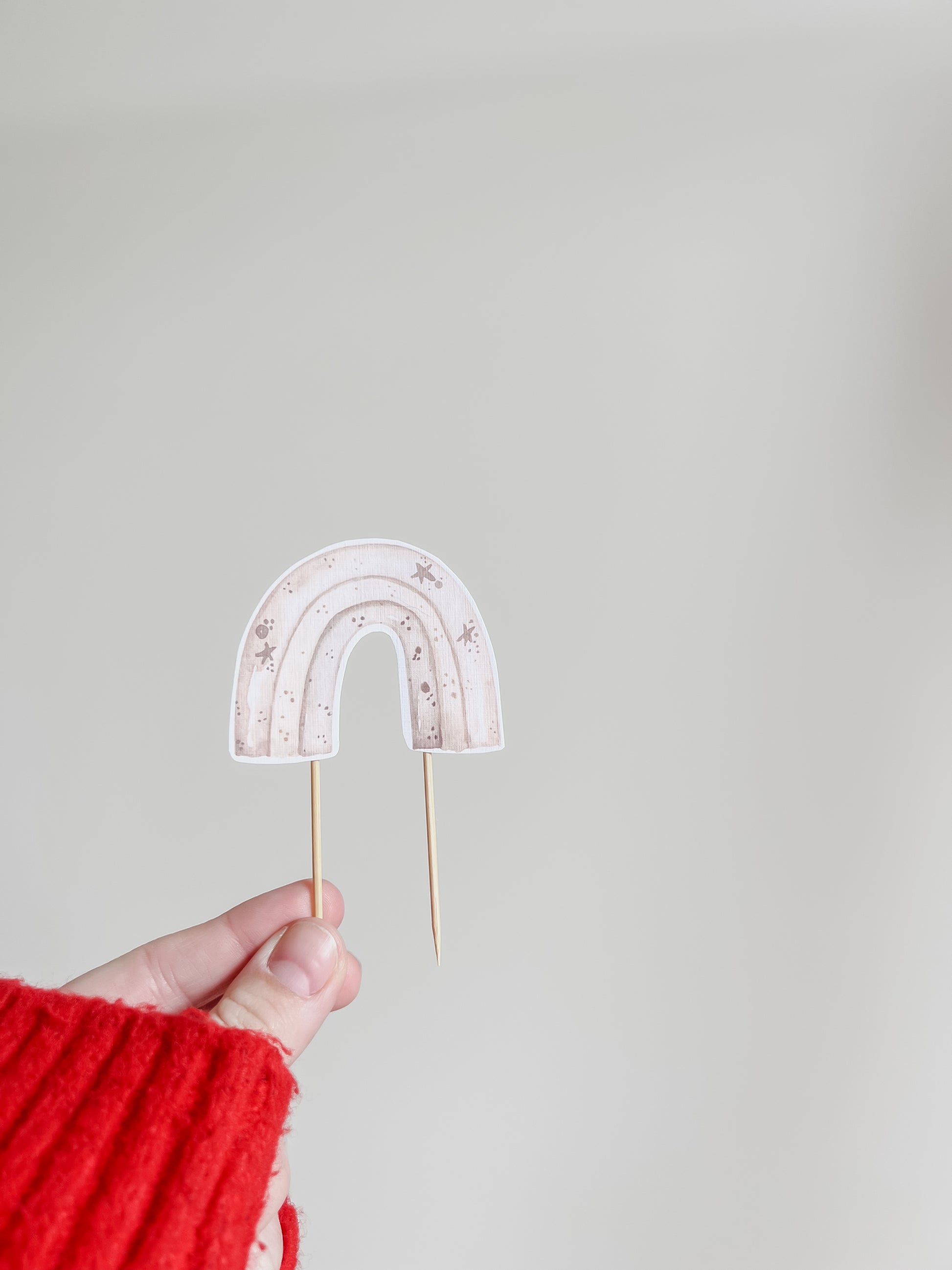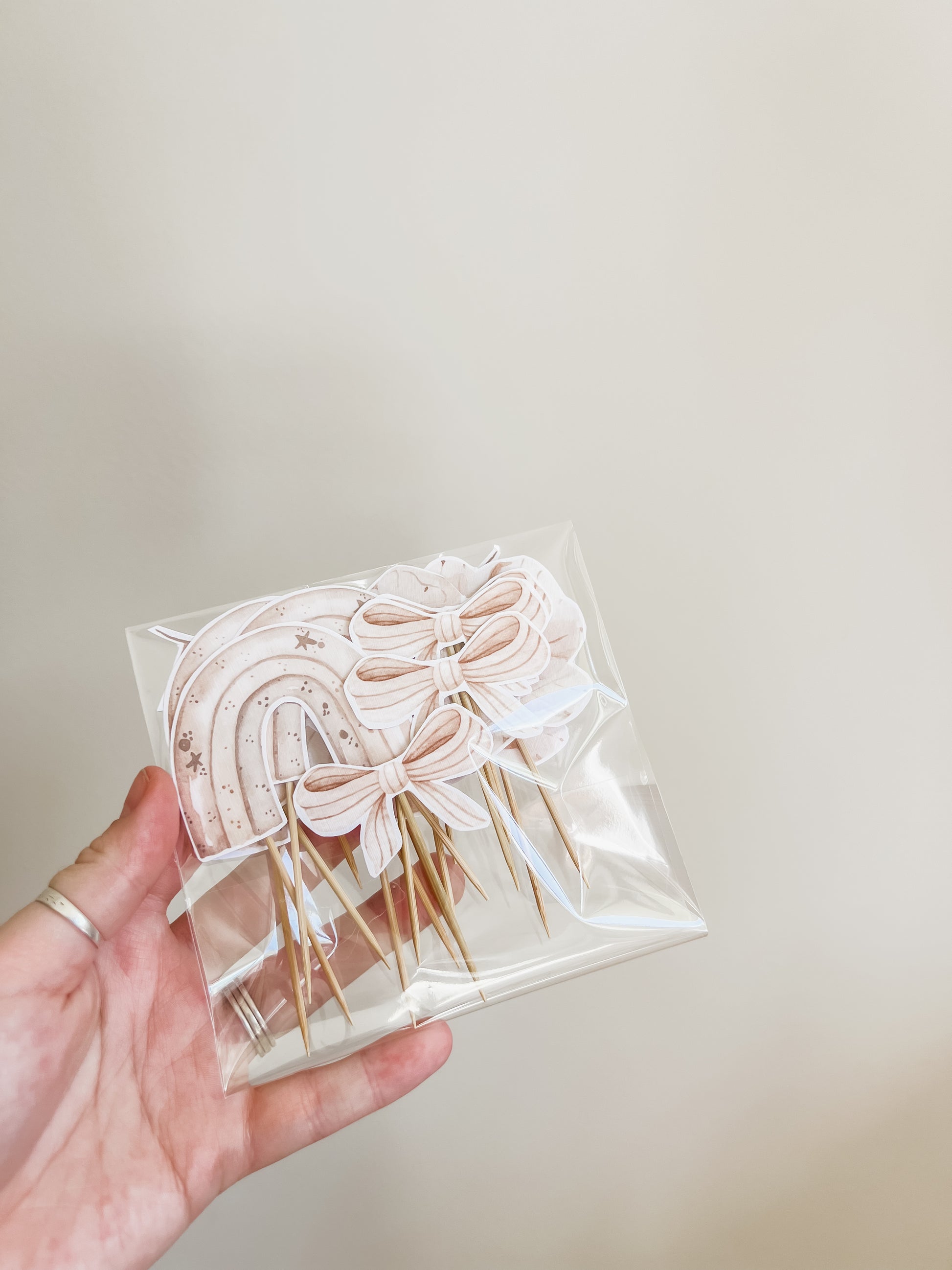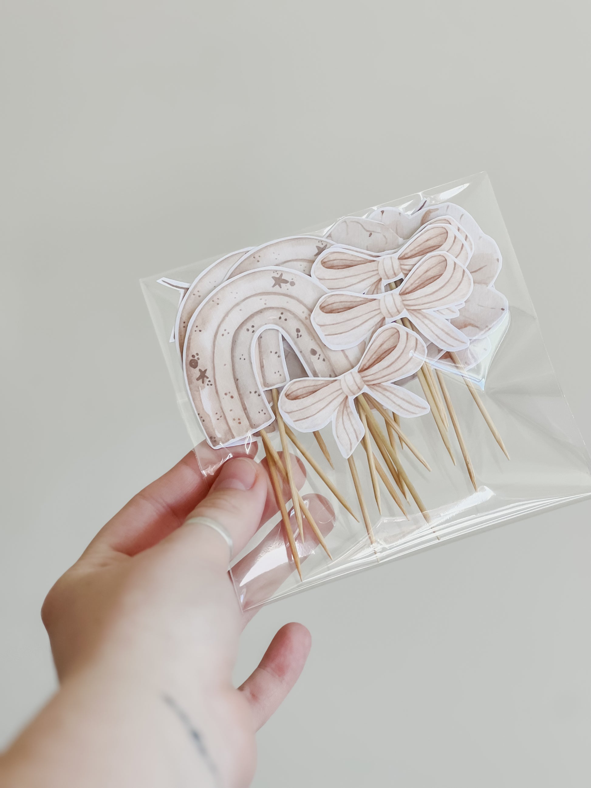 Elevate your celebration with these chic, neutral boho-style cupcake toppers featuring elegant beige flowers, delicate bows, and charming rainbows. Perfect for baby showers, birthdays, or any occasion, these toppers bring a soft, earthy vibe to your dessert table. Their minimalist design and natural tones make them a versatile and stylish addition to any event with a bohemian touch.