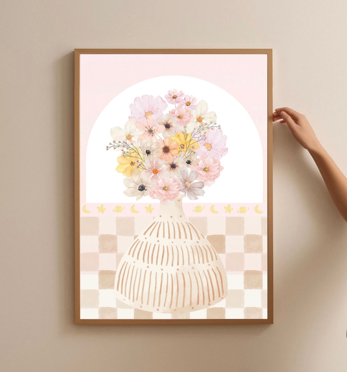 Bring a soft, boho vibe to your space with this elegant print featuring delicate pastel flowers arranged in a charming vase, set against a pink checkered background. The soft hues and whimsical design create a calming and stylish atmosphere, making it a perfect addition to nurseries, kids' bedrooms, or playrooms with a modern, bohemian touch.