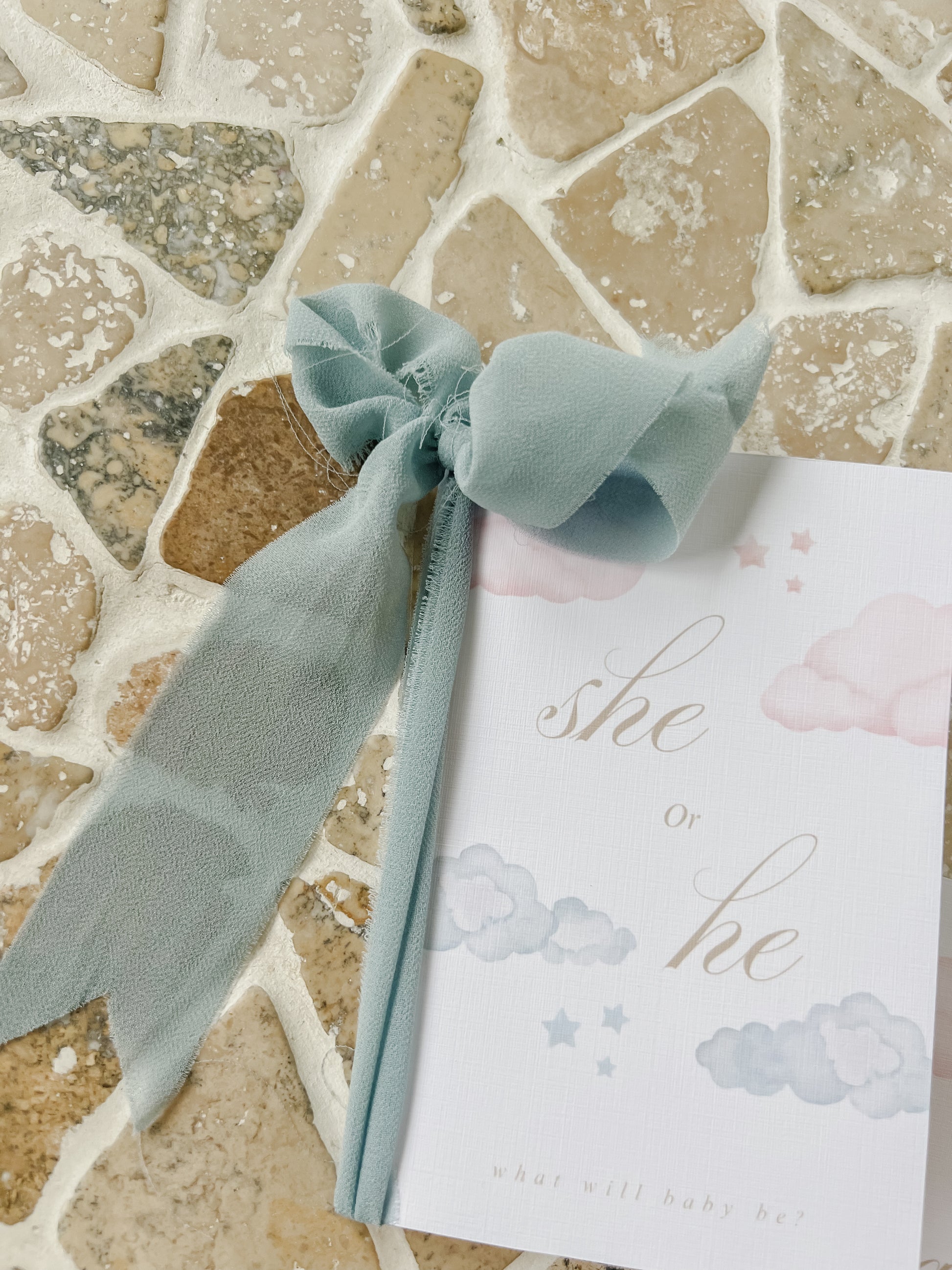 Dreamland is just one of three of our booklet styles. Our booklets come with a special card hidden inside that will reveal your babies gender & so beautifully designed for your enjoyment.
