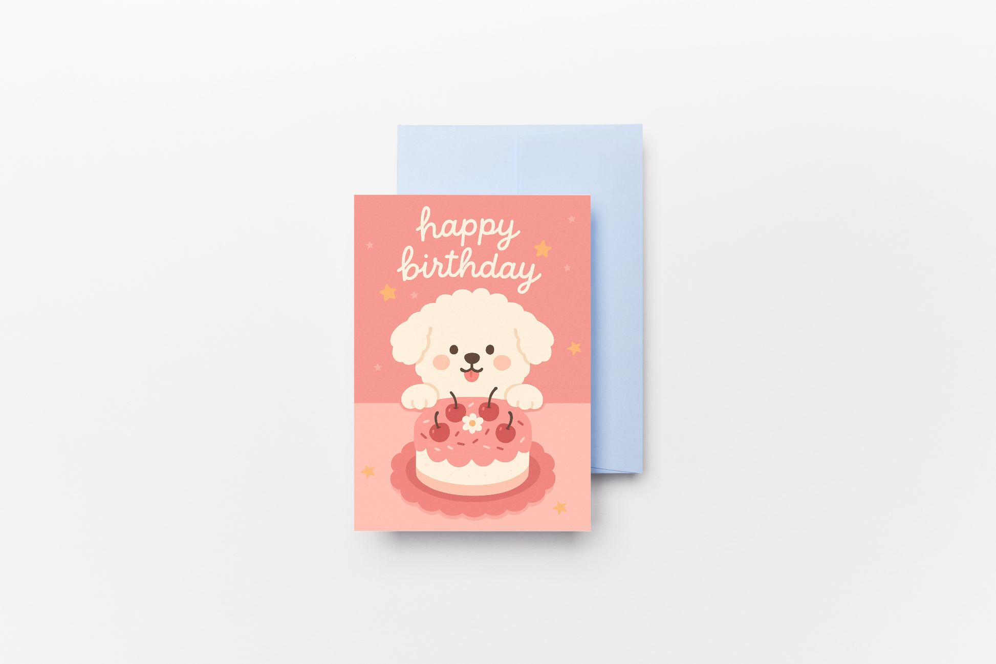 Celebrate in the sweetest way with this adorable pastel birthday card! Featuring a fluffy white puppy with rosy cheeks sitting behind a pink frosted cake topped with cherries, this design is perfect for dog lovers and anyone who adores cute designs. Set against a soft pink background with playful yellow stars, it brings a whimsical, joyful touch to any birthday celebration.