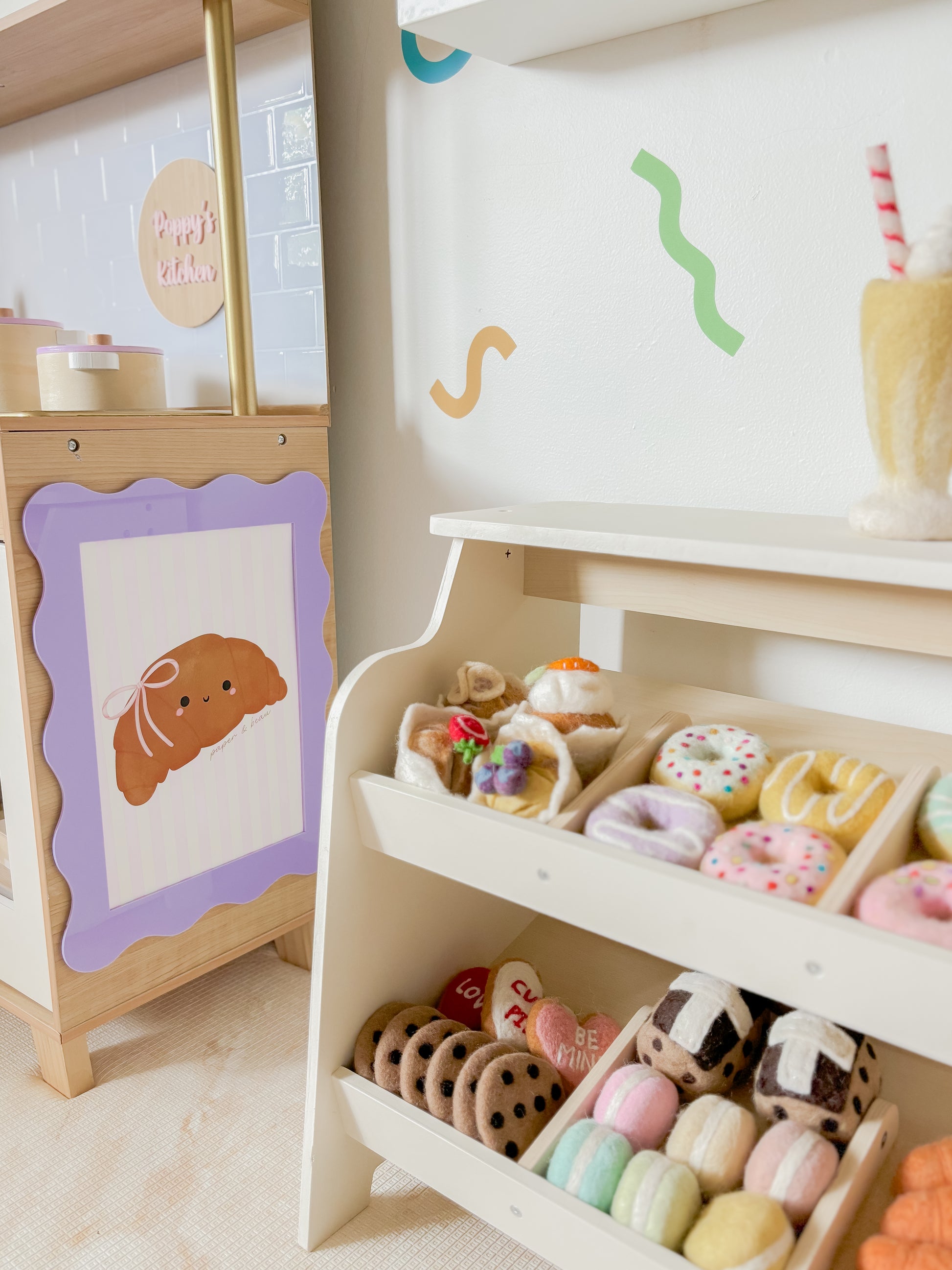 Say bonjour to the most charming pastry around — a buttery croissant topped with a dainty pink bow. Set against a soft background of butter-yellow and blush-pink stripes, this illustration has the sweetest candy-shop vibe, subtle yet full of whimsy. It’s light, playful, and oh-so-cute — perfect for kitchens, breakfast nooks, kids bedrooms or anywhere that could use a sprinkle of pastry magic.